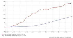 However, here in the UK in particular, many older people make the opposite mistake: becoming so averse to investment risk that they hold too much in cash. There is a false sense of comfort here because cash is readily at hand, but over time the spending power of that cash is eroded by inflation. See below a financial analysis of the change in value of Consumer Price Index (a common measure of inflation) compared with returns from 90-day cash deposits, over the last five years. This shows clearly how inflation outstrips cash held in a bank. So all things are best in moderation, including liquidity.